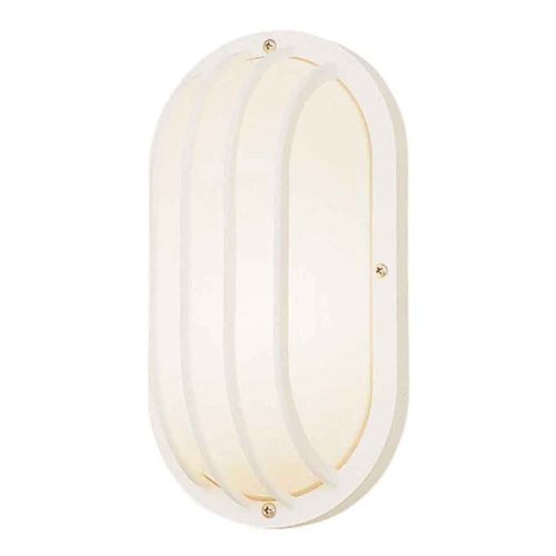 Finish:White, Glass:White Polycarbonate, Light Bulb:(1)60w A19 Med F Incand One-light oval bulk head fixture with cage.